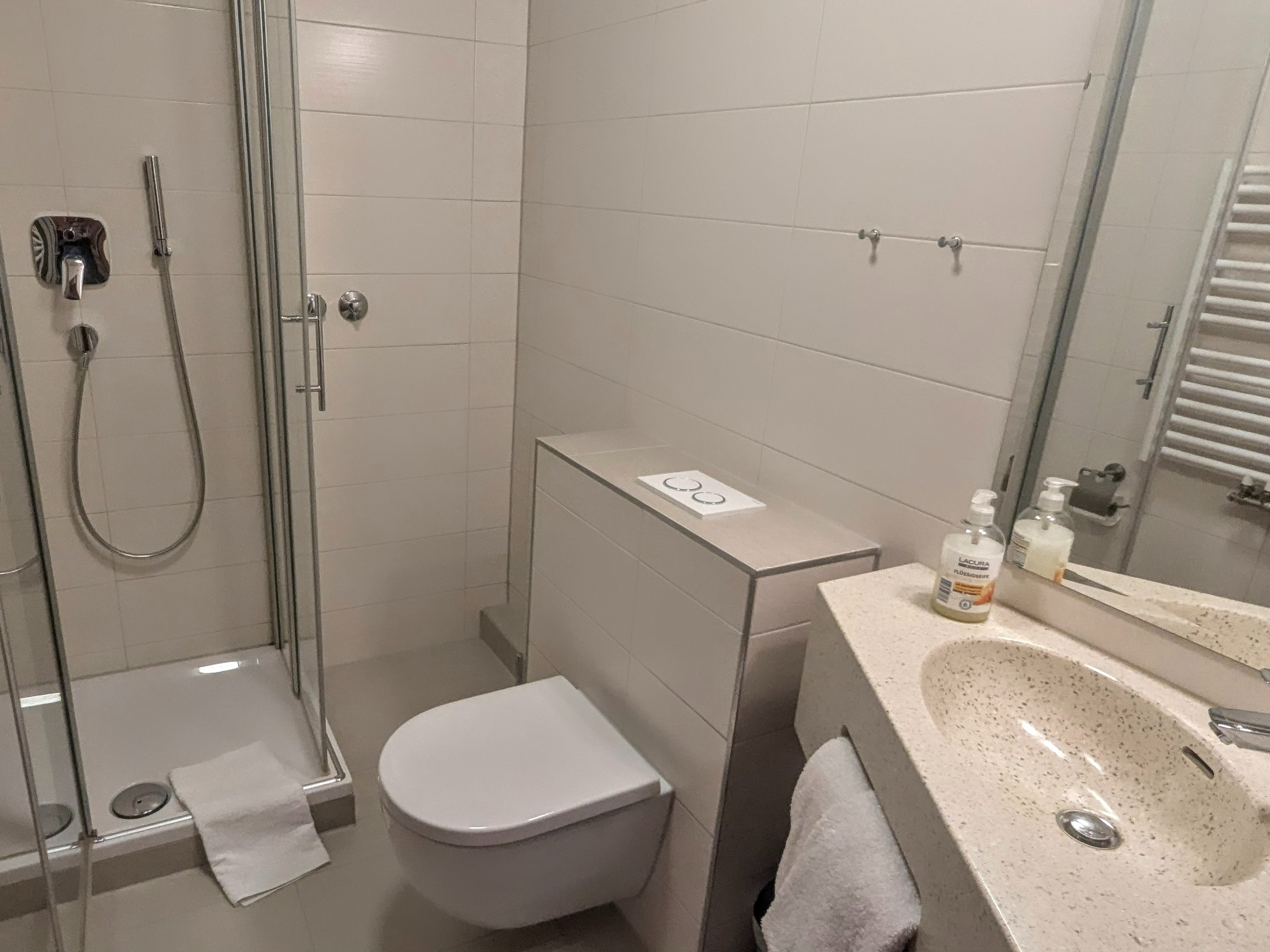 reichhaltiges Frühstücksbuffet. Bad/Dusche mit